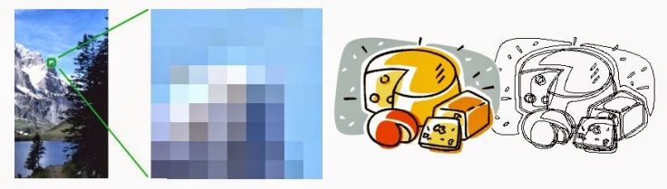 A bitmap (left) is made up of thousands of pixels on a grid. A vector (right) is made up of shapes that are colored in, preventing photo realistic blending but allowing re-sizing.