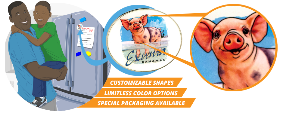 Full color photo insert placed inside a metal mould. Your choice of multiple plating colors for the magnet’s edge.