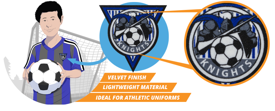 3D flock logos are a great alternative to embroidery. The process allows for high detail. Flock materials are lightweight and soft to the touch with a velvety finish. They are thin, durable and colorfast and can be applied with a heat press to polyester, cotton or nylon materials.